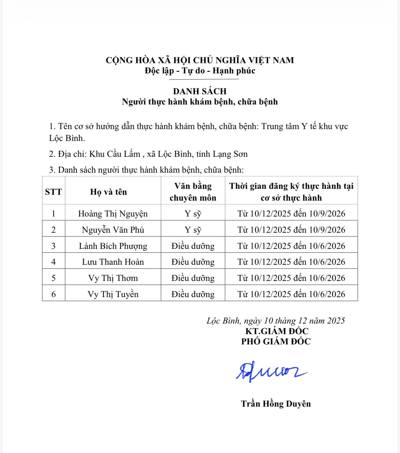Danh sách đăng ký người thực hành khám bệnh, chữa bệnh tại TTYT khu vực Lộc Bình