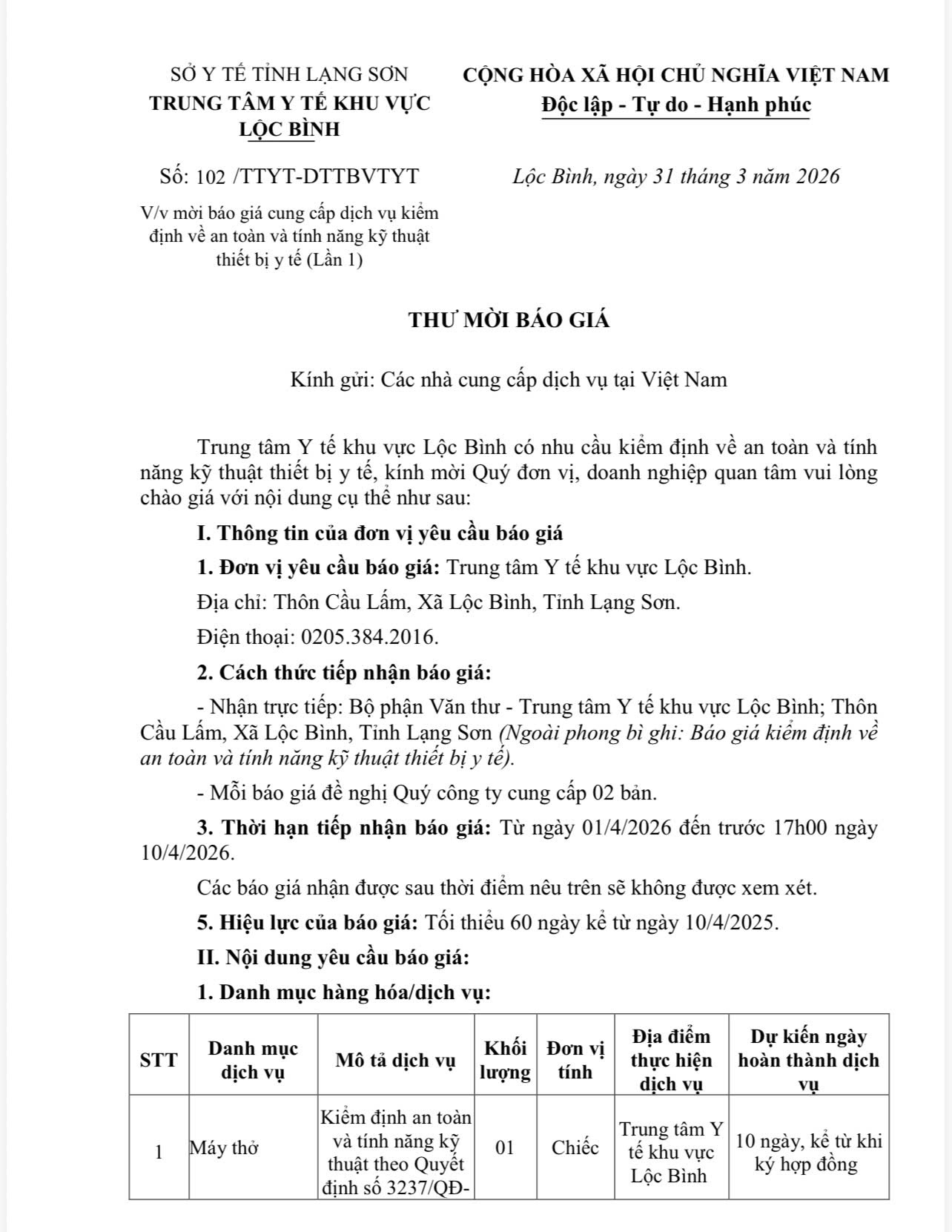 Mời báo giá cung cấp dịch vụ kiểm định về an toàn và tính năng kỹ thuật thiết bị y tế (lần 1)
