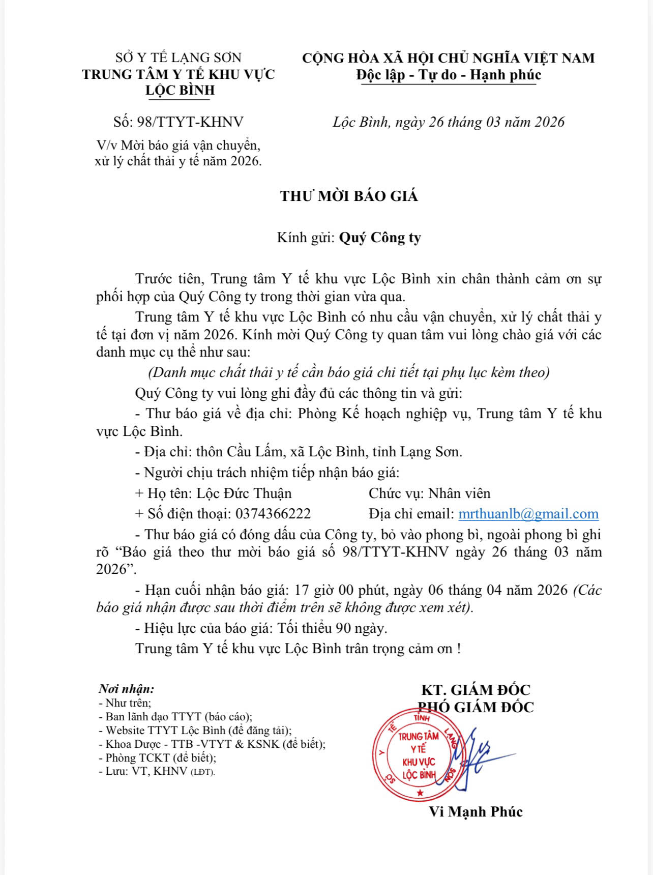 YÊU CẦU BÁO GIÁ Mua máy tính, máy in tại các khoa phòng thuộc Trung tâm Y tế huyện Lộc Bình năm 2025