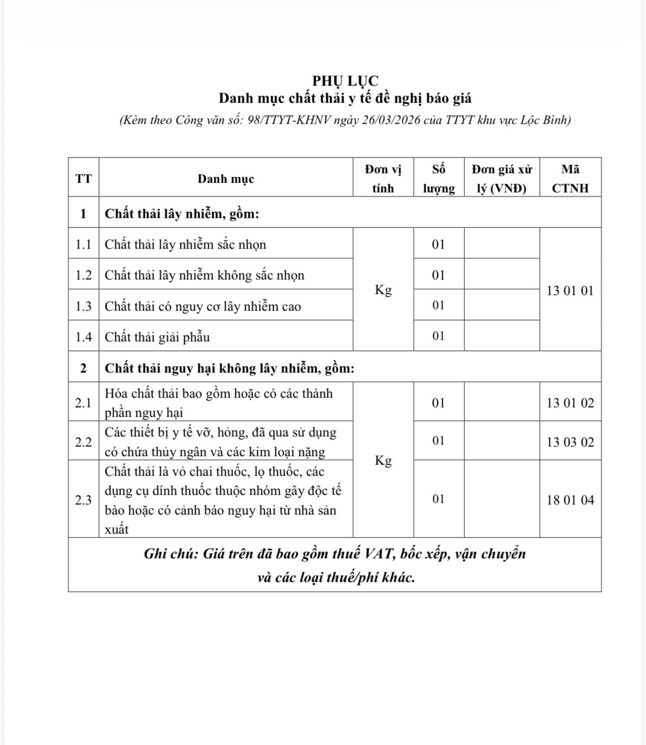 Về việc mời báo giá vận chuyển, xử lý chất thải y tế năm 2026