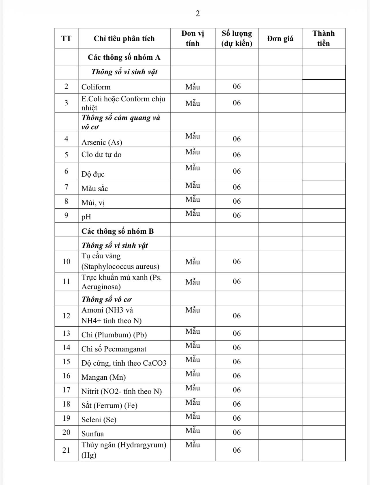 Mời báo giá ngoại kiểm chất lượng nước sử dụng cho mục đích sinh hoạt