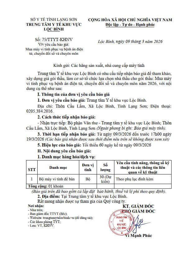 - Nhận trực tiếp: Bộ phận Văn thư - Trung tâm y tế khu vực Lộc Bình; Thôn Cầu Lấm, Xã Lộc Bình, Tỉnh Lạng Sơn (Ngoài phong bì ghi: Báo giá máy tính).