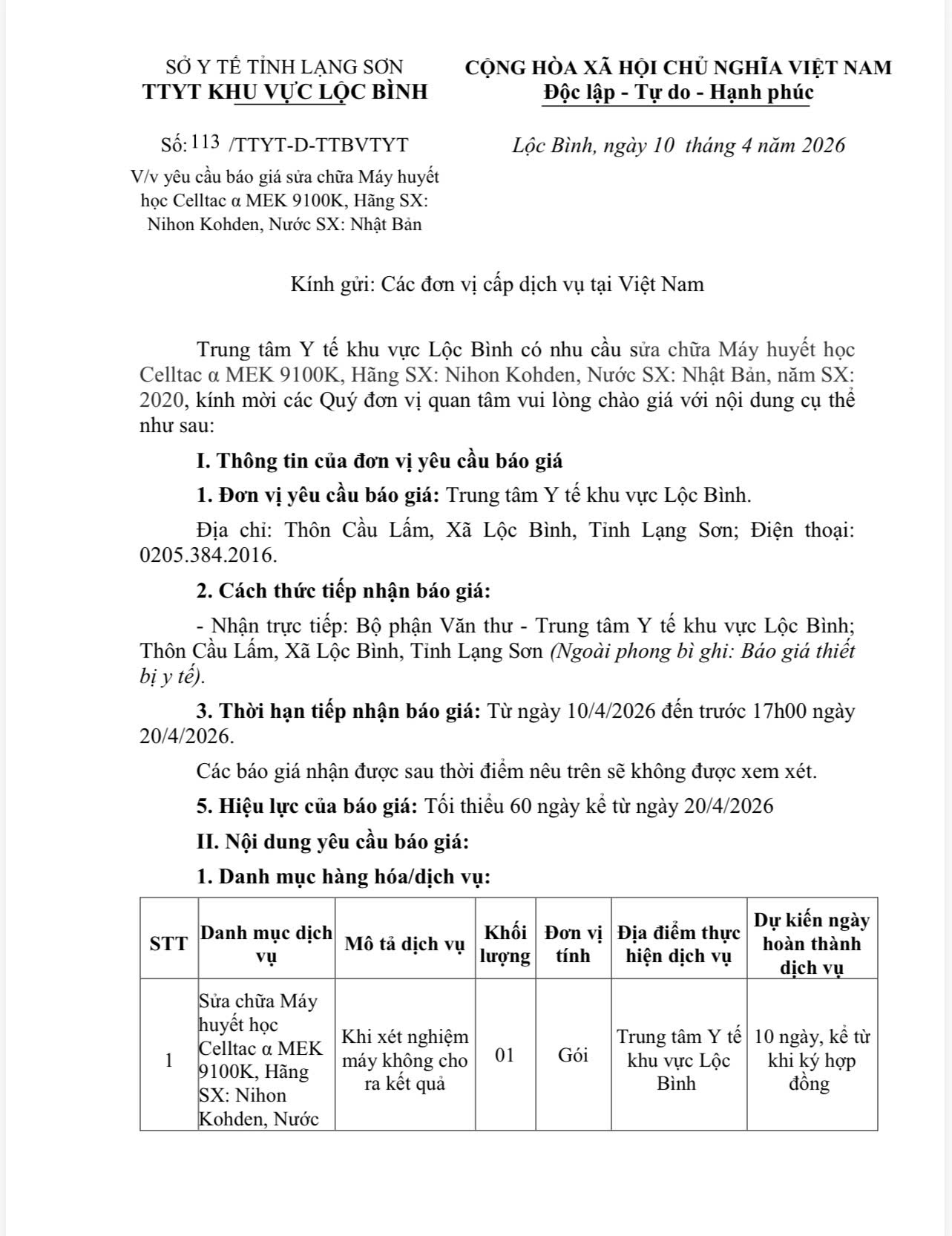 YÊU CẦU BÁO GIÁ Mua máy tính, máy in tại các khoa phòng thuộc Trung tâm Y tế huyện Lộc Bình năm 2025