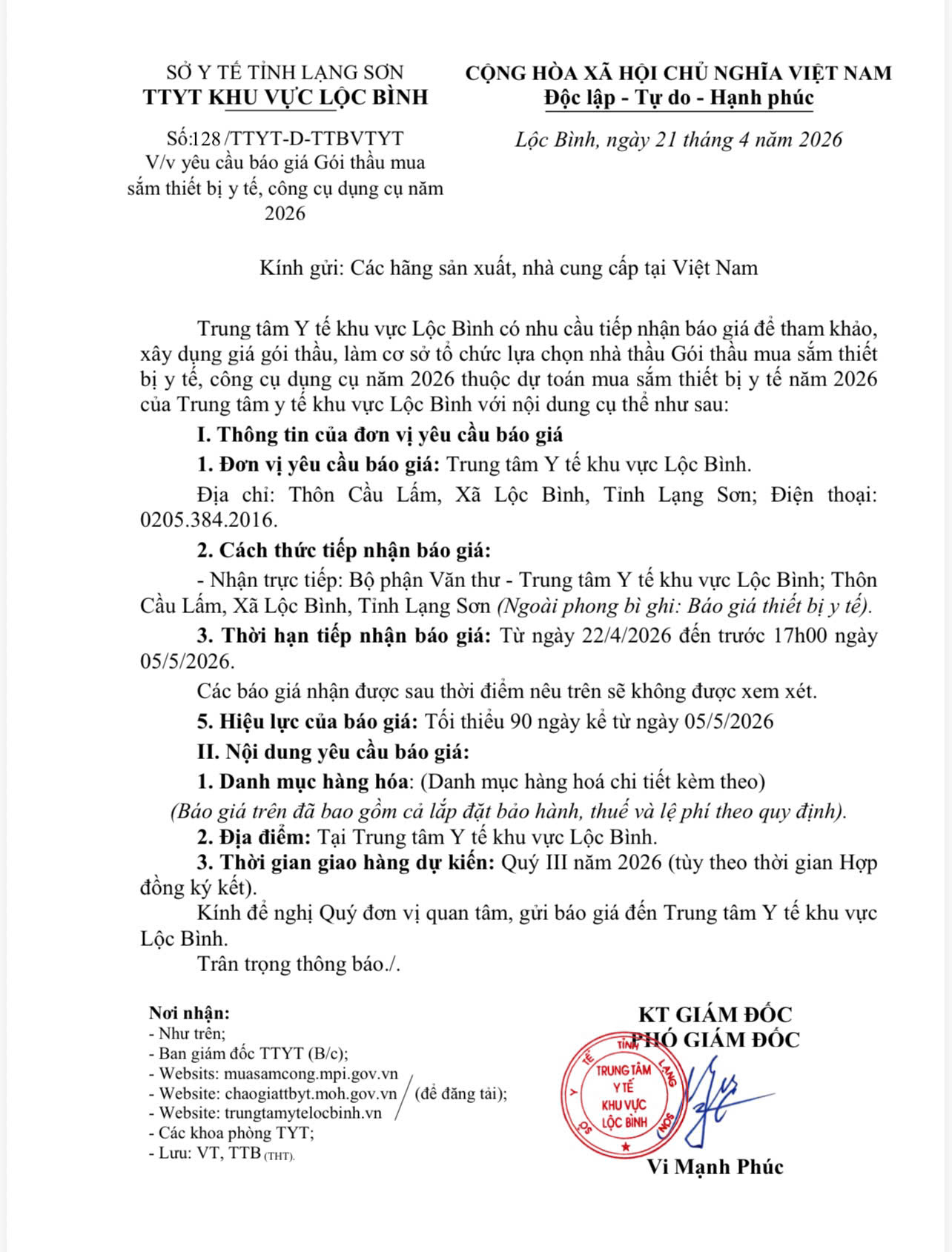 YÊU CẦU BÁO GIÁ Mua máy tính, máy in tại các khoa phòng thuộc Trung tâm Y tế huyện Lộc Bình năm 2025