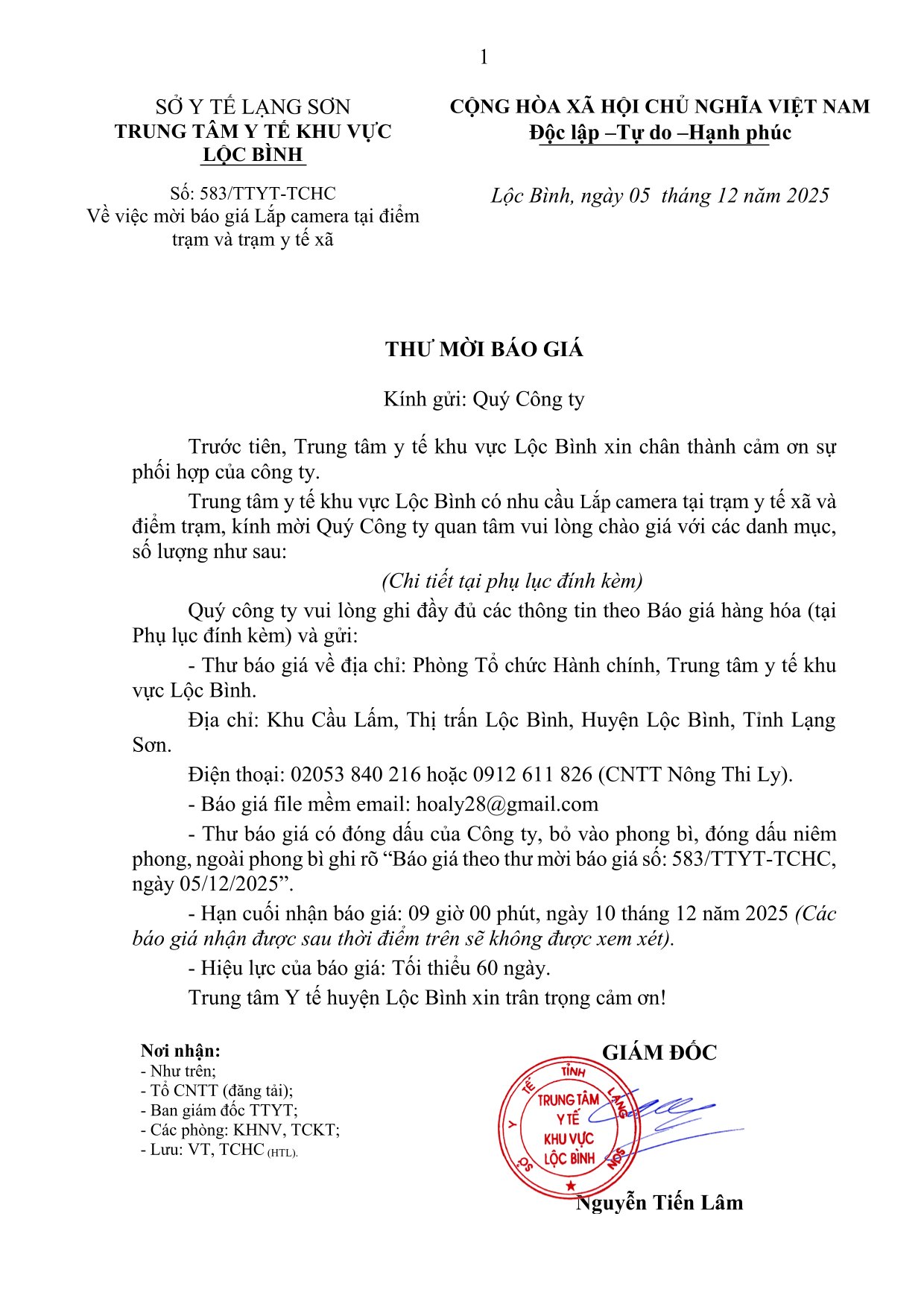 YÊU CẦU BÁO GIÁ Về việc đề nghị báo giá Lắp đặt Camera tại Khu vực Ngoại, Sản, Phòng mổ thuộc Trung tâm Y tế huyện Lộc Bình năm 2025