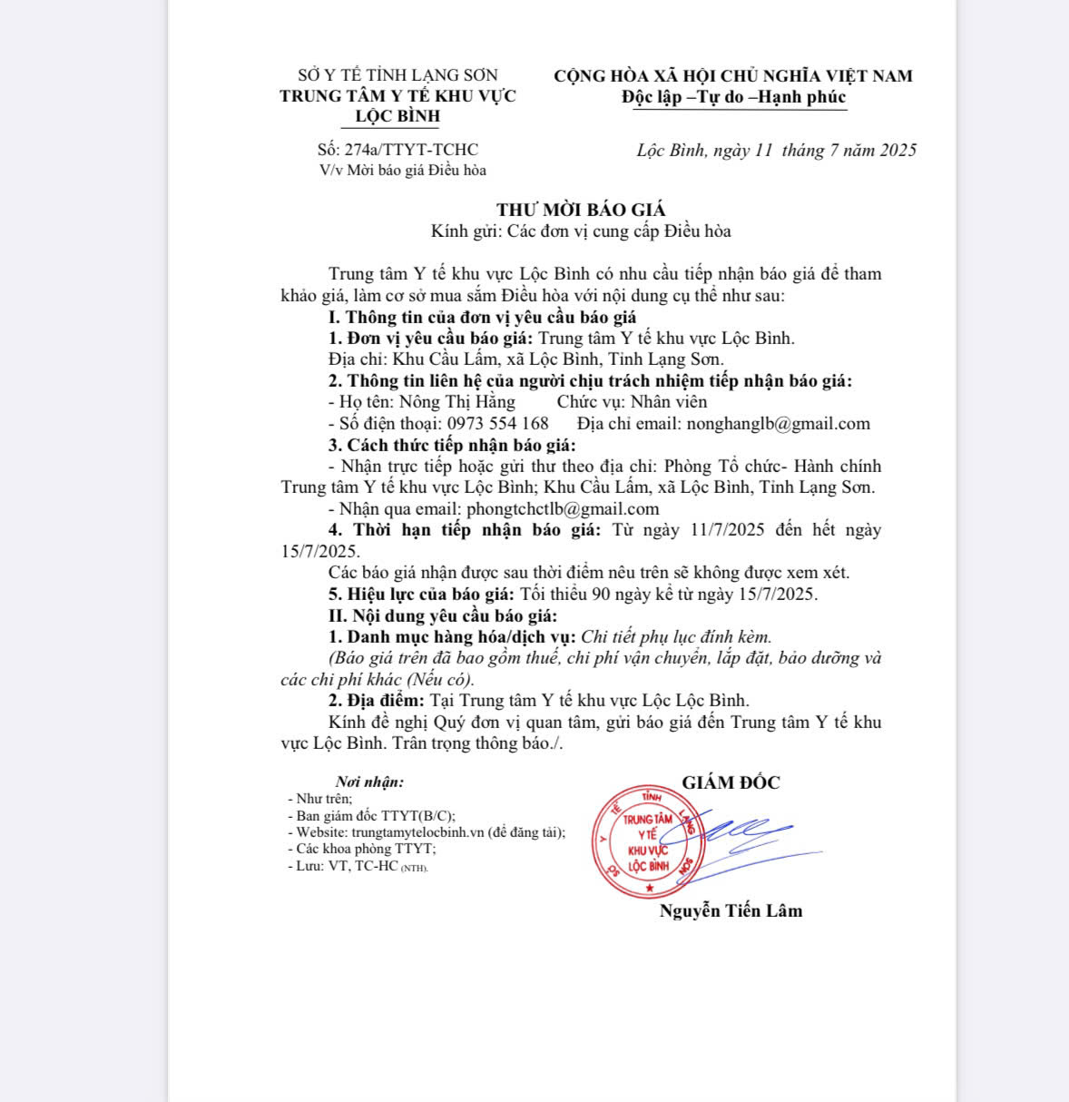 YÊU CẦU BÁO GIÁ Mua máy tính, máy in tại các khoa phòng thuộc Trung tâm Y tế huyện Lộc Bình năm 2025